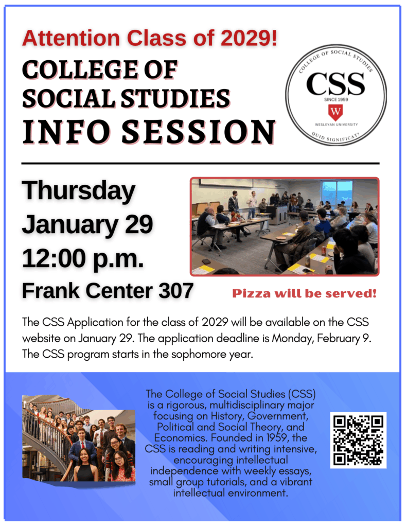 The CSS tutors and students invite you to a CSS Info Session on Thursday, January 29, 2026 at Noon in Frank Center 307.