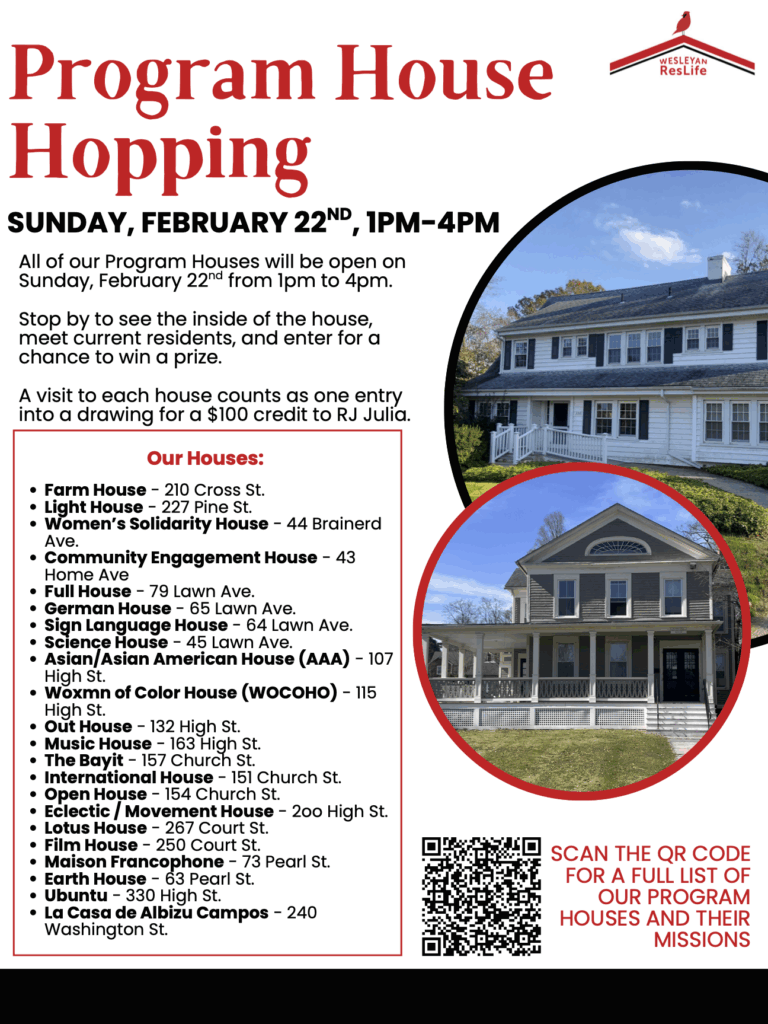Thinking about housing for sophomore year? Check out the Program House Hopping event on Sunday, February 22 from 1 – 4pm.